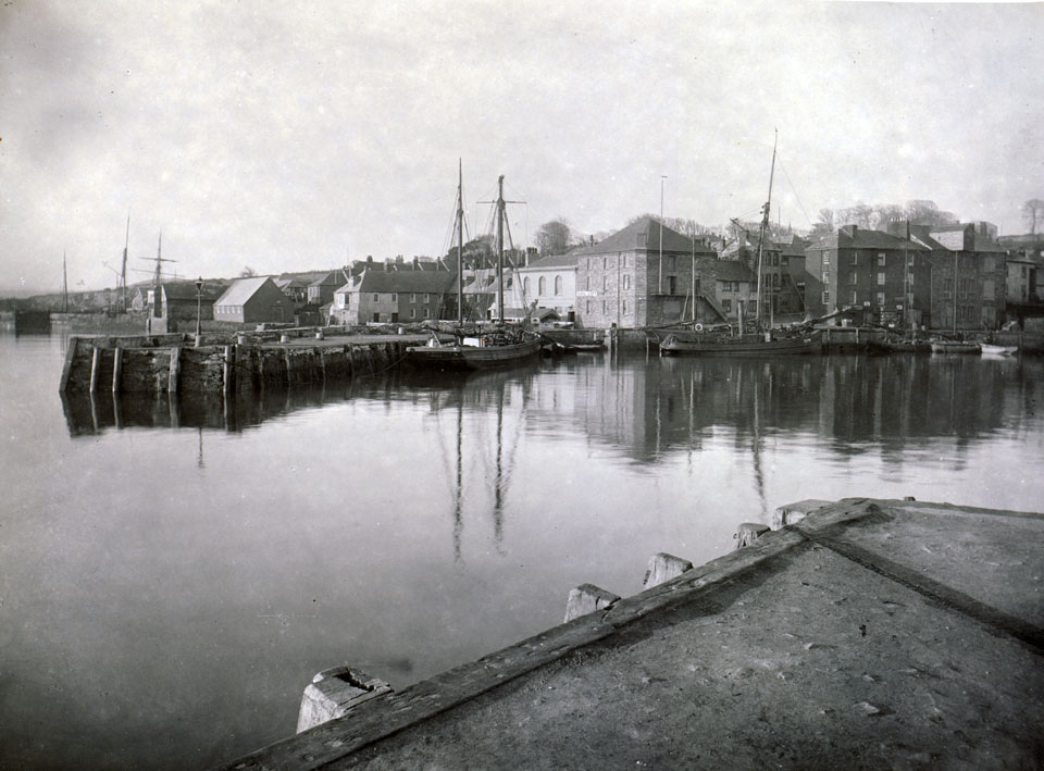 Description: A view of Padstow Harbour, showing from left to right: Higher Yard Dock and vessels in the Higher Yard; Ketch 'Ystwith'; Court House; Customs House and Customs Boat House and Gig; 'Sail Loft'; a Ketch discharging cargo; Steam tug 71 PW 'Princess May'; a Hotel; and local schooner and rigged barge. The ketch 'Ystwith' was converted from a schooner to a ketch c. 1894. She was registered in Padstow in 1891. The steam tug 'Princess May' arrived in Padstow in about 1895 and replaced the old paddle tug 'Amazon'. The railway arrived in Padstow in 1899 on the site of the Higher Yard (left in the photograph), which dates the image to about 1895-98. The schooner rigged barge (right in the photograph), was a rig unique to Padstow. They were used to take cargo up the River Camel to Wadebridge. See also 2016.50.1207.