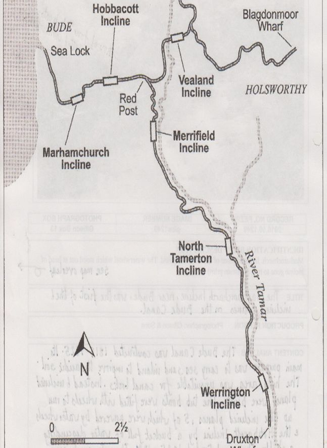 Description: A photograph of the Marhamchurch Incline, near Bude, which was the first of the inclined planes on the Bude Canal, with the ruin of the waterwheel at the head of the incline and row of four tub boats fitted with wheels, in the foreground. The Bude Canal was constructed between 1819 and 1825. Its main purpose was to carry sea sand inland to improve the acidic soil. The hilly area was unsuitable for canal locks, instead six inclined planes were built. The tub boats were fitted with wheels to run up the inclined planes, five of which were powered by water wheels and the Hobbacott Incline by a bucket full of water descending a shaft. The canal traded between 1825 and 1891. The water supply came from the Tamar Lake. The Canal reached near Launceston with another branch towards Holsworthy (see attached map). It was subsequently used for Bude's water supply.