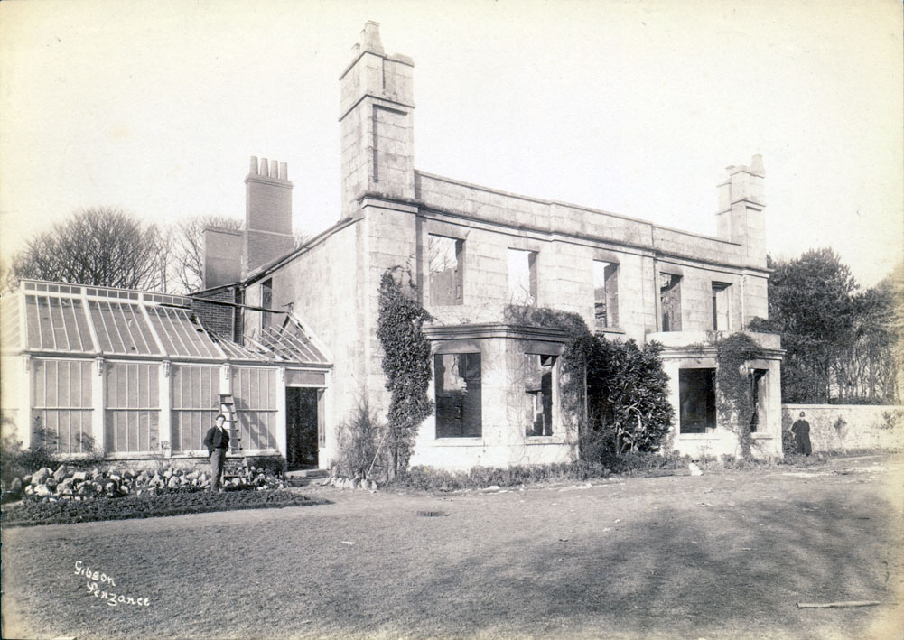 Description: A view of the fire damaged Poltair House, with two unidentified people stood either side of the building. The glass house to the left of the house is still standing although part of the roof has collapsed, but the roof of the main house and windows are missing although the chimney stacks remain. According to a local newspaper at the time, the fire was 'practically subdued when the water supply ran out and had there been a constant supply for the next quarter of an hour, there is little doubt that the flames would have been entirely extinguished'. Poltair Mansion House was built in 1802 for Richard Hichens originally of St Ives who married Margaret Trevaylor, and had nine children. Around 1800 he acquired the land of Poltair and built his mansion, finishing it in about 1802. Poltair became the home at various times of Dr Scobell, John Richards Esq, Russell Howell Esq, Col Trelawney and by 1893, was the residence of Lieut-Col Otho Glyn Bolitho.
