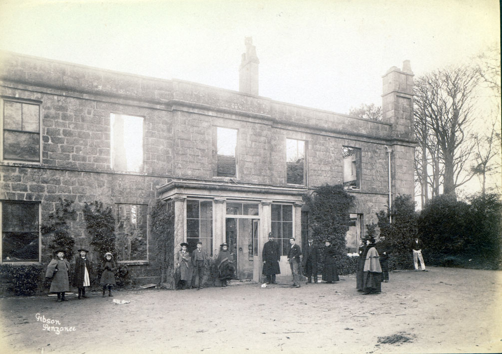 Description: A view of the fire damaged Poltair House, with a number of unidentified people stood outside, including (probably) a fire man stood in front of the porch which appears to have avoided major damage. According to a local newspaper at the time, the fire was 'practically subdued when the water supply ran out and had there been a constant supply for the next quarter of an hour, there is little doubt that the flames would have been entirely extinguished'. Poltair Mansion House was built in 1802 for Richard Hichens originally of St Ives who married Margaret Trevaylor, and had nine children. Around 1800 he acquired the land of Poltair and built his mansion, finishing it in about 1802. Poltair became the home at various times of Dr Scobell, John Richards Esq, Russell Howell Esq, Col Trelawney and by 1893, was the residence of Lieut-Col Otho Glyn Bolitho.