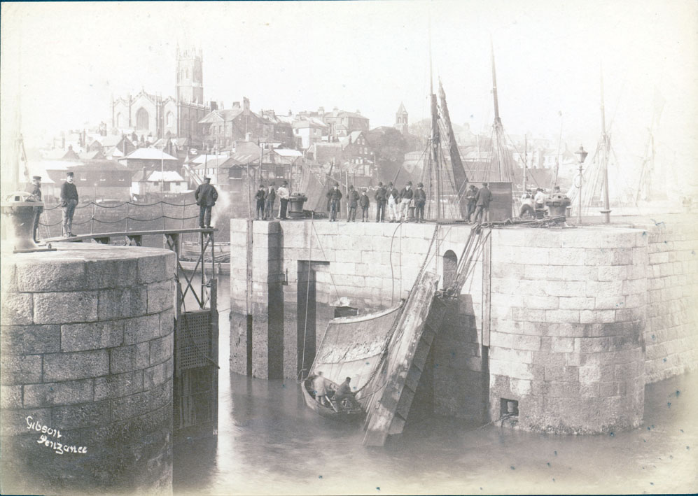 Description: Unidentified men on either side of Penzance quay. observing two men in a small boat who appear to be attaching a chain to the side of the gate which has broken away from the wall.