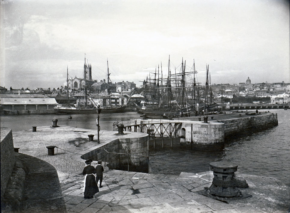 Description: A view of Penzance dock and harbour taken towards the town with a lady and small boy in the foreground. A barque and a number of coasting schooners are in the background and a steam vessel which might be the 'Greencastle' is also in view.