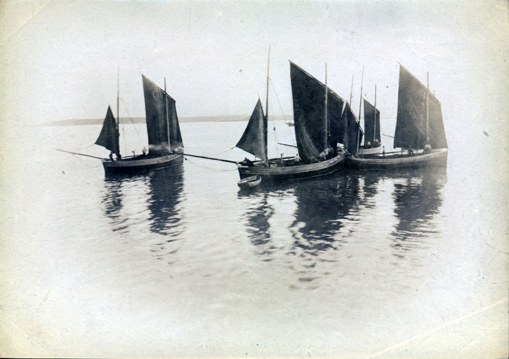 Description: Mackerel boats becalmed, Mount's Bay. The crew of the centre lugger are hoisting her foresail and she is towing her punt. All boats have PZ registrations.