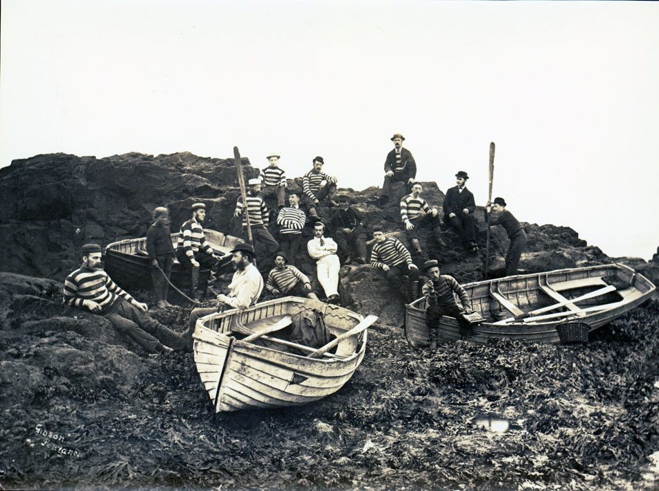 Description: A photograph of 16 members of the Nautilus Club posing for the camera on a rocky outcrop, which might be St Clement's Island, Mousehole. Many are wearing striped jerseys marked with the initials PNC (Penzance Nautilus Club) and the name of a boat. The boat names included: Hettie, Syren, Fairy, Nymph and Sylvia. In the foreground, the name of the boat written within a flag design is 'Mabel'.The Nymph and Sylvia later reappear as small rowing boats in the East Esplanade Regatta of 1888 (Cornish Telegraph 13 September 1888). In the middle of the photograph wearing darker clothing, a waist coat with watch chain and a cap, is an older man thought to be John Nicholls (Gaffer) the boat proprietor and founder of the club. The photograph can be dated to the 1880s when the Nautilus Club was active, but if the identification of John Nicholls is correct, the date is probably early 1880s. See also 2016.50.205 and 206.
