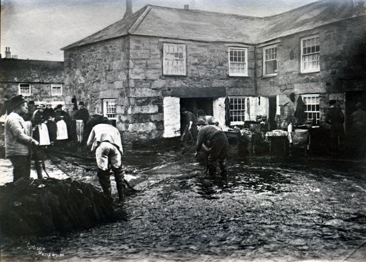 Description: These photographs show the aftermath of the floods at Newlyn following days of torrential rain. Early November 1894 had seen the heaviest rainfall that many in Newlyn could remember: it was incessant, causing many older folk to mutter "the rain it raineth every day". However, the evening of Sunday 11th into Monday 12th saw the heaviest yet and this added to the accumulated water and debris on the previous days and the drainage systems could no longer cope. The swollen river burst its banks, bringing down the bridge at St Peter's Church and inundating the roads before it. Residents were trapped in their ho0mes by the water. At its height the flood reached almost to the ceiling of the worst affected houses, breaking through doors and windows causing furniture and clothes to be washed away. Interior walls were destroyed, running one cottage into another. The suddenness of the event had given no time to escape or to rescue possessions and stores. Mr Bath's coal store is reported as losing 100 or 200 tons of coal an locals were seen rescuing quantities of it from the beach. It was the worst flooding in living memory, but it was noted at the time that it could have been worse: at least it happened in daylight hours, in the dark it would have been harder to assess the level of water and there may have been loss of life. By Monday evening the area where the roads (now known as the Coombe, Chywoone Hill and The Strand) meet was passable only by boat. As the waters receded the work of cleaning-up began as shown here. Even then because of the mud the roads were impassable. The photographs also show the value of the Gibson photographs as a social and historical record of the time. Within days the pictures were advertised in the Cornishman as "instantaneous photographs of characteristic scenes of Newlyn under water". Following the devastating floods, a relief fund was set up. The Cornish Telegraph printed a list of subscribers in December and included T.C Gotch (Secretary of the Fund); Stanhope Forbes; Frank Bramley; Norman Garstin; Walter Langley; Fred Hall; Henry Rheam and Chevallier Taylor. Their donations ranged from 10 shillings to two guineas. Sources: Cornishman and Cornish Telegraph online.