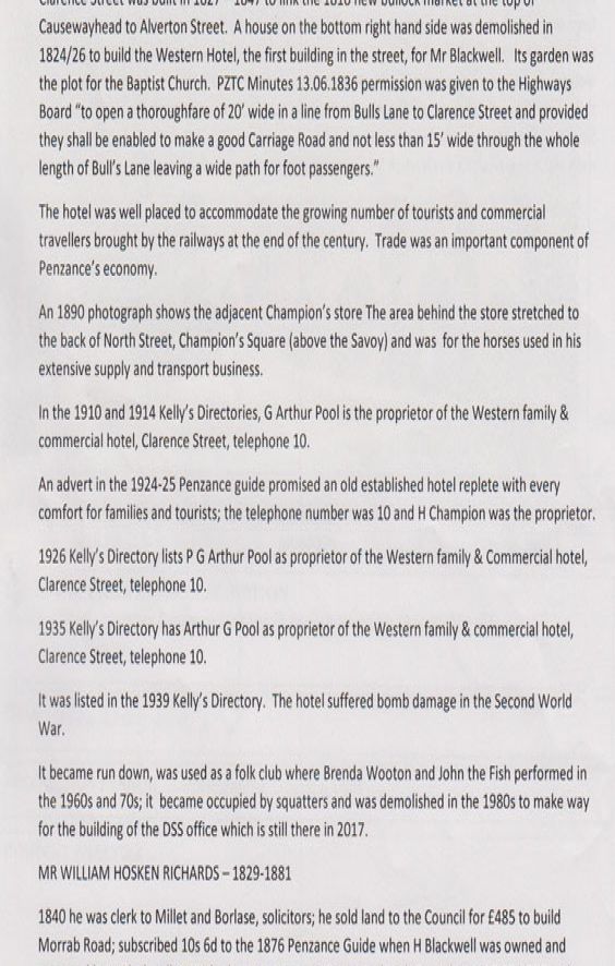 Description: A photograph of the Western Hotel with the hotel's horse bus and Mr Hosken Richards. Other unidentified people are stood on the corner and in Clarence Street, facing the camera.
