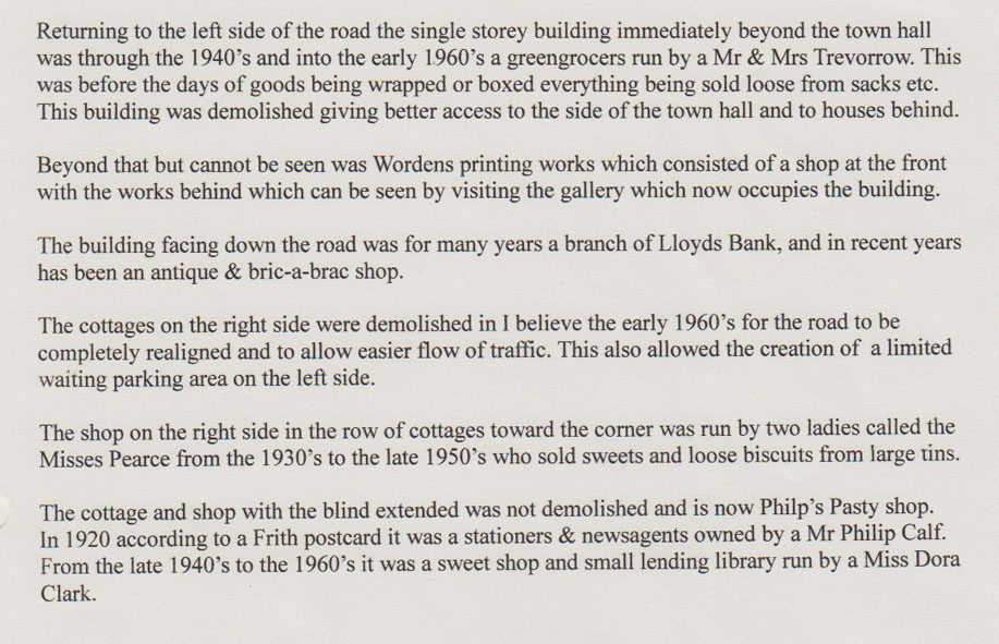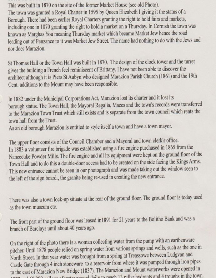Description: A photograph from Market Place, Marazion, looking towards Fore Street.The building on the left is St Thomas' Hall or Marazion Town Hall built in 1870. A woman collects water from a pump in an earthenware pitcher in the foreground. More information about the image is given in the attached file.