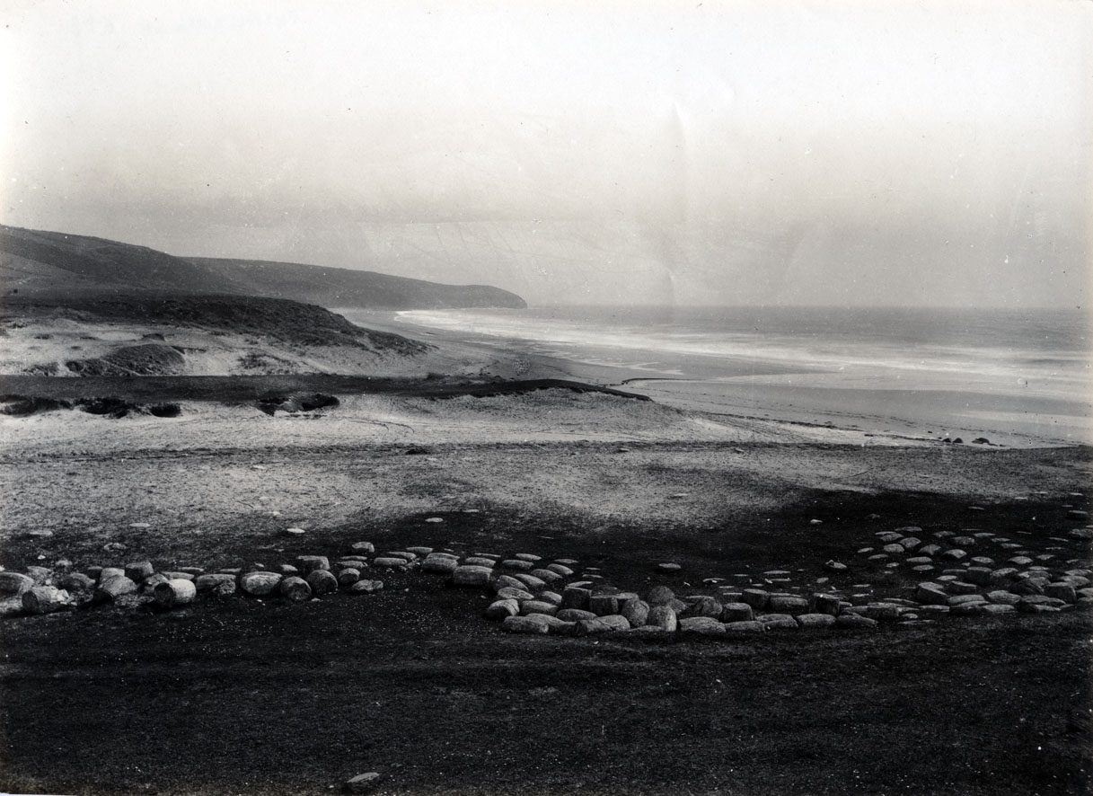 Description: A view of Praa Sands with a scattering of blocks on the beach. The Royal Cornwall Gazette of 22 June 1899 describes a visit to Praa Sands by members of The British Women's Temperance Association. One of the curiosities they saw on the beach was a series of identical cement blocks in the shape of barrels. Apparently, they had been there for many years apart from some that had been taken and used to make garden walls locally (Cornishman 21 December 1933). The mystery of how they got there goes back to 1871 when the Austrian barque, "Grissi", with its cargo of cement in barrels was wrecked on the beach (Cornishman 9 October 1884 provides a summary and the Cornish Telegraph of 8 March 1871, a fuller account of the rescue and wreck). The sea water had hardened the cement and the wooden barrels either rotted away or were prised off for recycling. This photograph probably dates from the 1880s - 1890s.