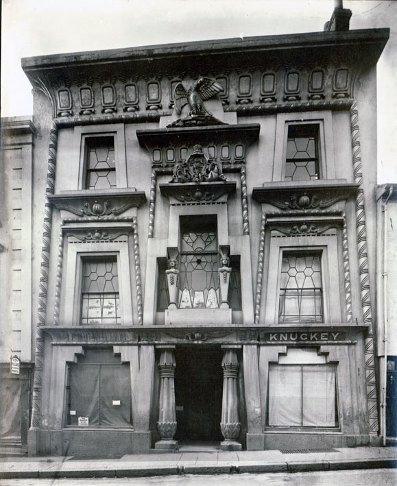 Description: A photograph of the Egyptian House, with the name 'Knuckey' above the window on the right hand side and a 'To let' sign in the window on the left. The adjoining shop to the left has a sign, Agent for Pullars Dye Works, Perth. All of the windows in the Egyptian House have the blinds closed. The Egyptian House was built for the PZ merchant Lavin in the 1830s and may have been designed by John Foulston, a Plymouth architect, although it does not appear in either his water colours of 1835 or his book 'Public Buildings in the West' of 1838.