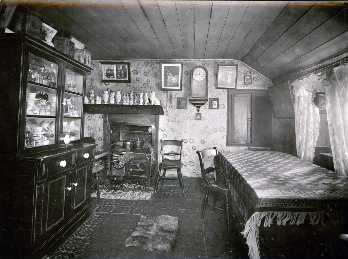Description: The interior of a West Penwith cottage living room. The floor covering would have been linoleum which was widely used at this time as it was cheap, durable, cleanable, water resistant and reduced breakage of china. A rag rug is in front of the Cornish range (a new one would be made each winter) and a 'shaggy' rug in the foreground near the table. The range is probably from Holman's St Just, with decorated iron and brass work with fender in front. The oven is to the right, grate to the left, slab 30" wide which was the hot plate. Overall width was 36", and the kettle and sauce pans were heated on top, as was the flat iron. The rack above was for heating plates, drying clothes etc and would have sold for 35 shillings (about £225 in 2017) by Holman's of Camborne. In the china cabinet to the left would be crockery for every day use and special occasions, cutlery in the drawers and other items underneath. The table was covered with a heavy cloth which would have been removed for meals and possibly covered by an oil cloth. The cupboard to the right would have housed brooms etc. The large pictures on the wall are possibly lithographs and the small pictures family photographs. The long case wall clock would have contained workings which were mass produced at the time, possibly American or Swiss and cases were often added in the UK. The table cloth would have been chenille and the curtains light cotton. The ceiling probably had a coffin trap in the centre.