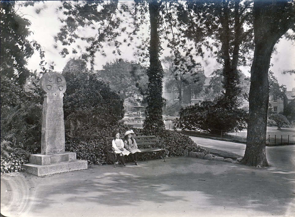 Description: Two girls seated beside the Penzance Market Cross in Morrab Gardens. The gardens cover an area of approximately 3 acres largely on the south side of Morrab House which was built for Samuel Pidwell in 1841, and was later acquired along with additional land by the Corporation of Penzance in 1888. Tenders were invited for converting the grassy slope running from the house down towards the sea into a municipal park. The winning entry was from garden designer Reginald Upcher of Portland Place, London; his design which was followed faithfully, was opened to the public in 1889. The Market Cross is said to date from the 11th Century and stood previously in the Greenmarket at the corner of Causewayhead (formerly known as North Street). This location or one slightly to the west along Alverton Street was said to have been the centre of the old town boundary circle. Subsequently the cross was moved to the then Market House in 1868 and was relocated to Morrab Gardens in 1899 by the Penzance Natural History and Antiquarian Society. The cross now stands adjacent to Penlee House in Penlee Park.