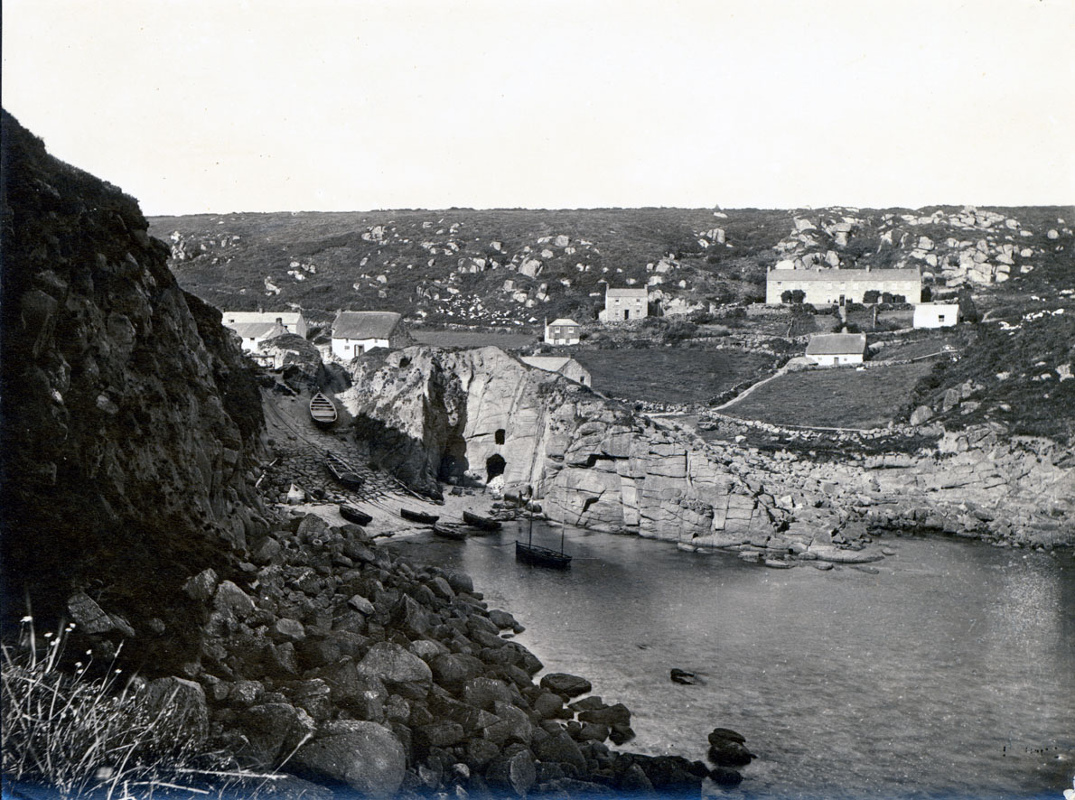 Description: A view of Porthgwarra Cove, two Seine boats and some other small boats, and from left to right, Rowe's Cottages (which are now demolished and replaced by a Seine Net Store), the house lived in by the Rowe family in the centre of the picture, Jackson Terrace to the right and the original farm house below Jackson Terrace.