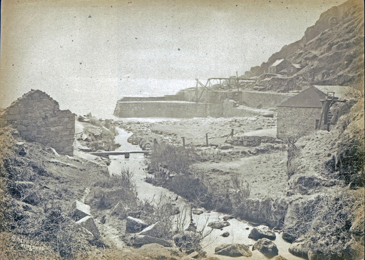Description: A photograph of Lamorna Cove, showing from left to right: the Old Blacksmiths Shop; the Pier (which was washed away in 1911); the Stone Loading Gantry; Granite Quarry Count House; Magazine; Five cottages built in 1880 and the Water Wheel & Launder. This image was taken between 1880 and 1911 when the pier was washed away. It was rebuilt several times and lastly in 1950s by Councillor John Daniel who also built the cafe with much of the stone taken from the Count House - the foundations of which are still in place. All of the Cove and Buildings are now owned by Mr Stephenson from Liverpool who kindly passed on his knowledge of Lamorna.