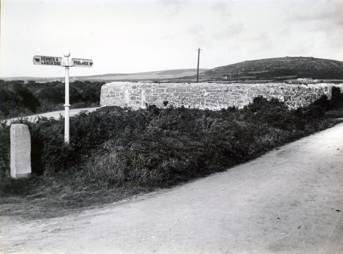 Description: This photograph has the signpost to Sennen & Lands End (to the left), and Penzance (to the right) in the foreground and the wall of the Quakers burial ground to the right. The Quaker or Friends' Burial Ground is located 1.5 miles east of Sennen Church Town where the roads from Penzance and St Just meet in a fork. The ground is so named because of the proximity to the nearby Brea Farm. A quadrangular wall, 54 ft by 46 ft encloses the site. There is no gateway or opening into the site which is set apart from any buildings or habitation, but within the wall adjacent to the St Just road are two upright granite posts indicating where an entrance once existed. Now, projecting stones on either side of the wall provide the only means of access. Set within the exterior of the wall is a slate tablet with the words ...'Friends' Burial Ground - Brea in which 36 interments took place between the years 1659-1789.