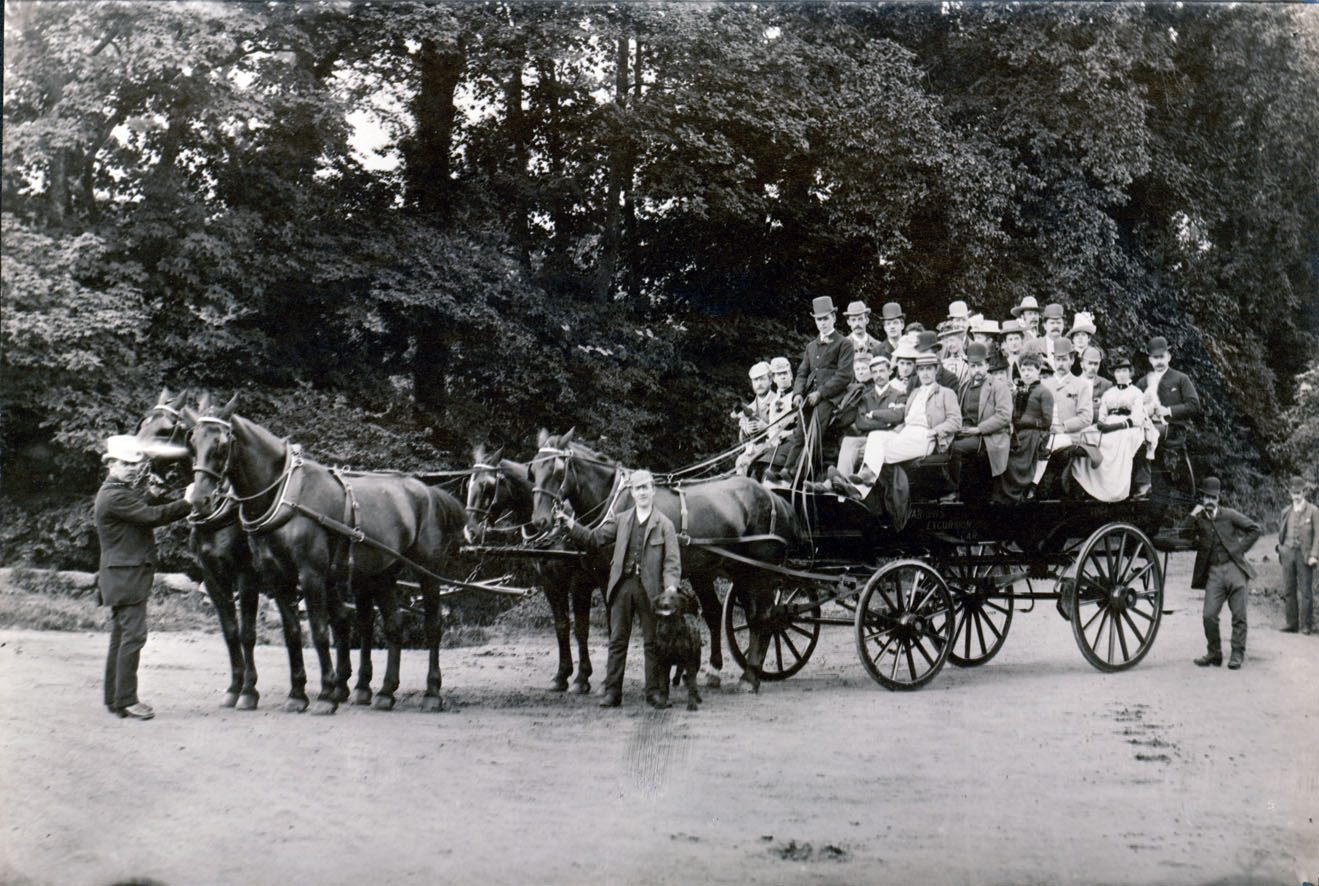 Description: The Jersey Car was very popular in Jersey and Guernsey for visitor excursions and became popular in England. This photograph of the four horse drawn vehicle shows a full wagon or 'charabanc' prior to an outing from Penzance. There are five benches with low backs. The front bench has two passengers on either side of the driver, who sits on a raised seat. There are five benches with five passengers per bench which meant that the Jersey car had a maximum capacity of 25 passengers. The two men holding the horses steady for the photo and the two at the rear are probably Warren's employees and the well dressed man holding the lead horses could be Mr Warren. It was common practice for photographs to be taken before the excursion, which were then available for sale the next day, and available as postcards from the beginning of the 20th century. The passengers were always well dressed, in suits for men and long dresses for ladies and hats for everyone. On hilly sections of the road to Lands End or Logan Rock, for example, gentlemen would have to alight and walk alongside. The horse drawn charabanc was the precursor of the motor charabanc, with benches and a side door or each bench, in the early decades of the 20th century which later developed into touring coaches.
