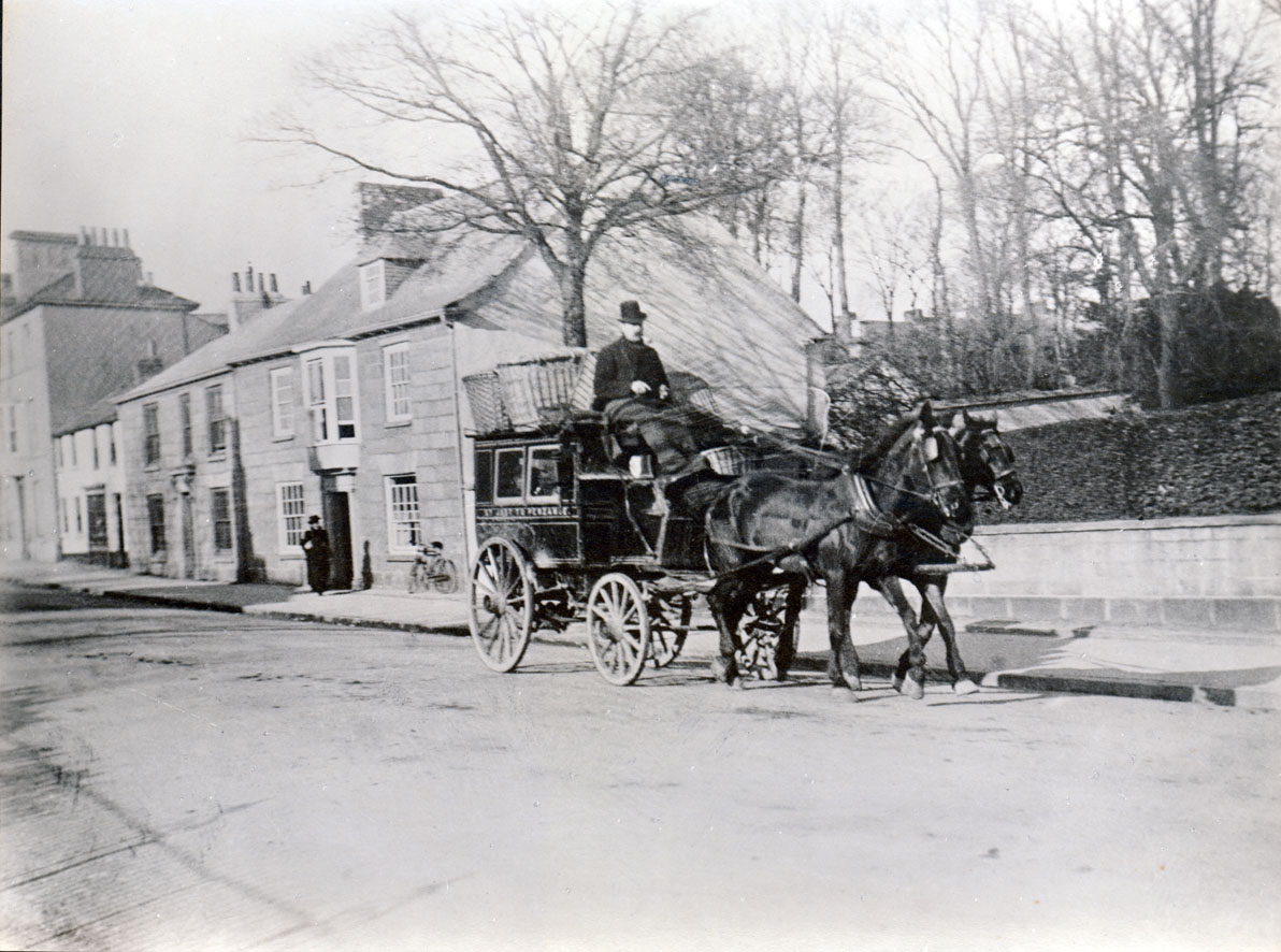 Description: A photograph depicting a two horse omnibus on the side of which the words ST JUST TO PENZANCE indicates that this is a regular passenger service between the two western most towns in Cornwall. The carriage is seen entering Penzance along Alverton Road adjacent to the plot of land now occupied by the Rosmellyn Surgery but formerly the location of Trevear House. The large double fronted granite house seen behind the carriage is No 7 Alverton Road which is now occupied by the Alverton Surgery. In 1891, this was the home of 84 year-old Mary St Aubyn and her three sisters Johnanna (80), Martha (80) and Hebe (76). The double fronted house beyond this is No 8 Alverton Road at the time occupied by 58 year-old William Dodge, retired surgeon and General Practitioner, his wife Charity (62) and their two daughters. On the opposite side of the road (out of view) stood Bellair House which was destroyed in WWII.