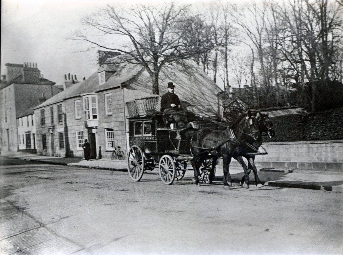 Description: A photograph depicting a two horse omnibus on the side of which the words ST JUST TO PENZANCE indicates that this is a regular passenger service between the two western most towns in Cornwall. The carriage is seen entering Penzance along Alverton Road adjacent to the plot of land now occupied by the Rosmellyn Surgery but formerly the location of Trevear House. The large double fronted granite house seen behind the carriage is No 7 Alverton Road which is now occupied by the Alverton Surgery. In 1891, this was the home of 84 year-old Mary St Aubyn and her three sisters Johnanna (80), Martha (80) and Hebe (76). The double fronted house beyond this is No 8 Alverton Road at the time occupied by 58 year-old William Dodge, retired surgeon and General Practitioner, his wife Charity (62) and their two daughters. On the opposite side of the road (out of view) stood Bellair House which was destroyed in WWII.