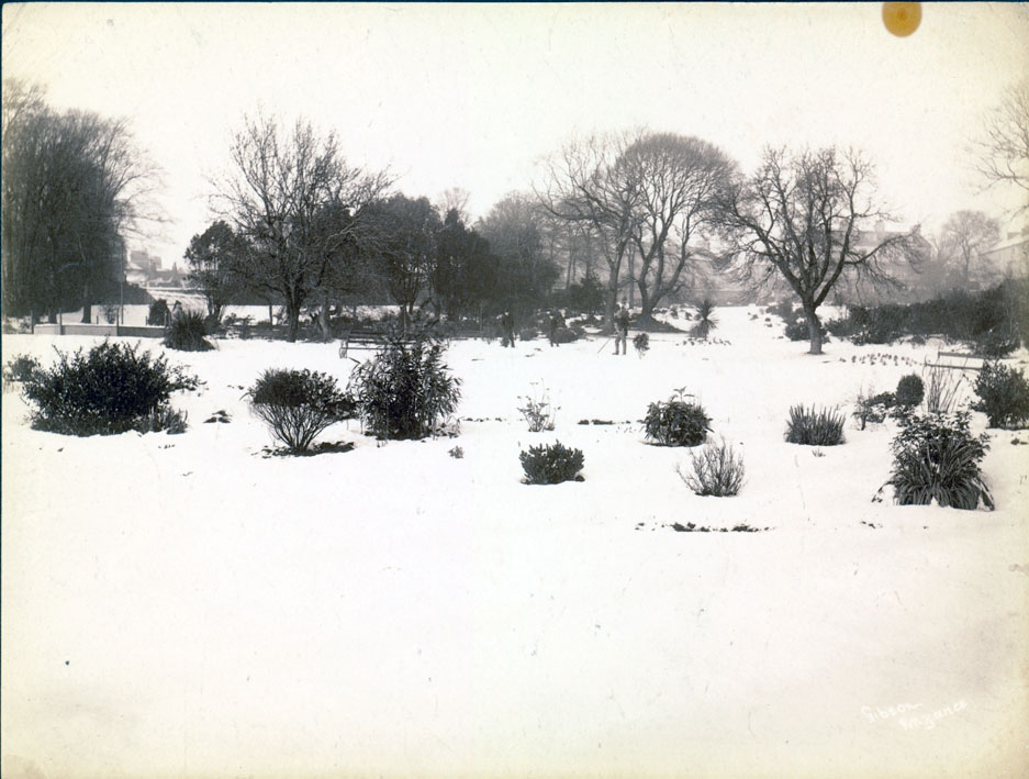 Description: A photograph of Morrab Gardens, Penzance, after the snow blizzard of March 9 1891.