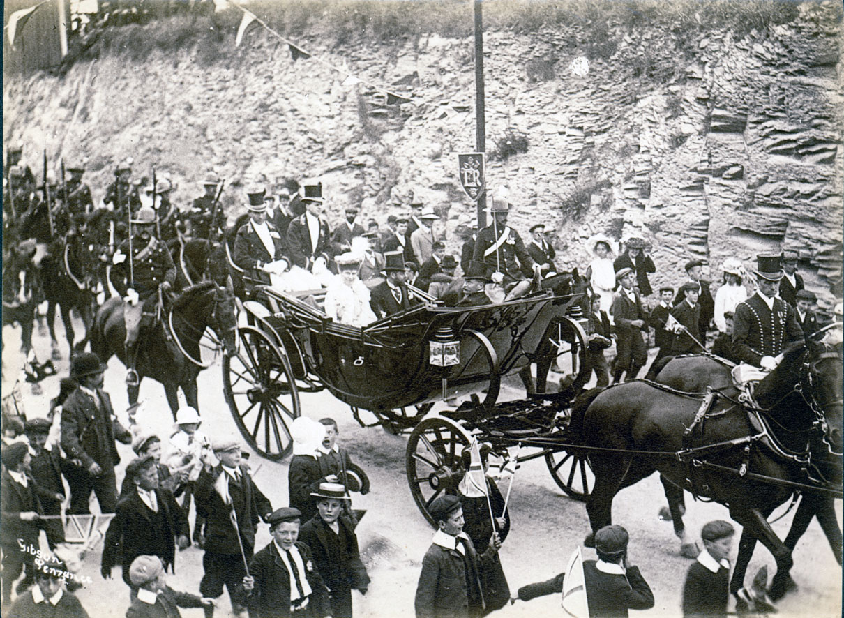Description: This photograph forms part of a series (0655 to 0671) relating to the visit of the Prince and Princess of Wales to Cornwall in 1903. It was taken on 15 July 1903, as part of the visit of the Prince and Princess of Wales (who became George V and Queen Mary) to Truro for the consecration of the nave at Truro Cathedral. The image is of the Royal party's procession through the City - possibly taken on Richmond Hill - with children in the foreground who have been given a flag and a bun each.