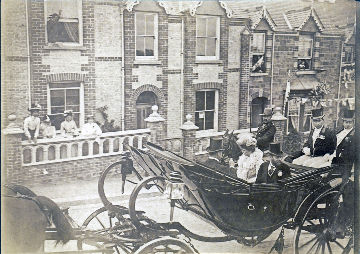 Description: The Prince and Princess of Wales (who became King George V and Queen Mary) in an open carriage, in Daniell Street, Truro, on their drive round the city that followed a luncheon served after the formal opening of Truro Cathedral Nave. This photograph forms part of a series (0655 to 0671) relating to the visit of the Prince and Princess of Wales to Cornwall in 1903. An extract from the West Briton of 16 July 1903, reported that: "The speeches lasted so long that instead of starting at a quarter to four, it was 4.15pm before the Prince and Princess of Wales entered their carriage. Followed by other carriages Lord Falmouth and party, their Royal Highnesses proceeded at a slow pace by way of Lemon Street, Daniell Street, Treyew Road, Station Road, Richmond Hill, Frances Street and River Street to Boscawen Street and thence to Tregothnan escorted as upon their entry into the city. It was a few minutes after 5pm when the procession passed the Municipal buildings on the way to Tregothnan. From the top of Daniell Street to the railway station the route was lined by school children, who, with their parents and guardians, had the exclusive use of the pavements. Each child was provided with a bun and a flag".