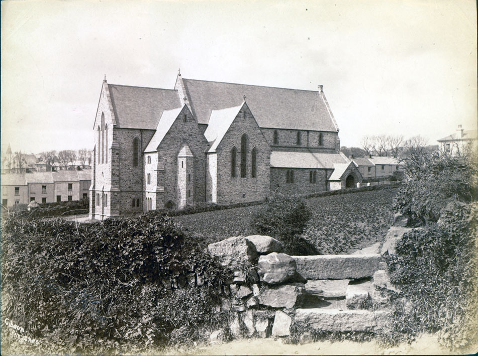 Description: A view of St John's Church, Penzance, with a row of terrace houses in the background and stone steps and hedgerow in the foreground. Designed by Piers St Aubyn FRIBA, St John's Church was built to accommodate the spiritual needs of the inhabitants of the newly built developments in East Penzance "The Battlefields". The Anglican parish church was dedicated to St John the Baptist. The parish was formed from St Mary's parish in 1883 to serve the east part of Penzance, while St Mary's served Penzance west. The church is sited at the top of Trewartha Terrace. It is built in the traditional style of elvan with Hemhill stone dressing. The foundation stone was laid on St John's Eve 1880 and was consecrated on 4 October 1881 at a cost of £7000 (over £781,000 in 2016). It was built of, and consists of, a chancel, nave of four bays, transept, aisles, east and west porches and has one bell and can hold 600 people. The register dates from 1881. Sources: Wikipedia and "The Cornwall Village" by CFWI.