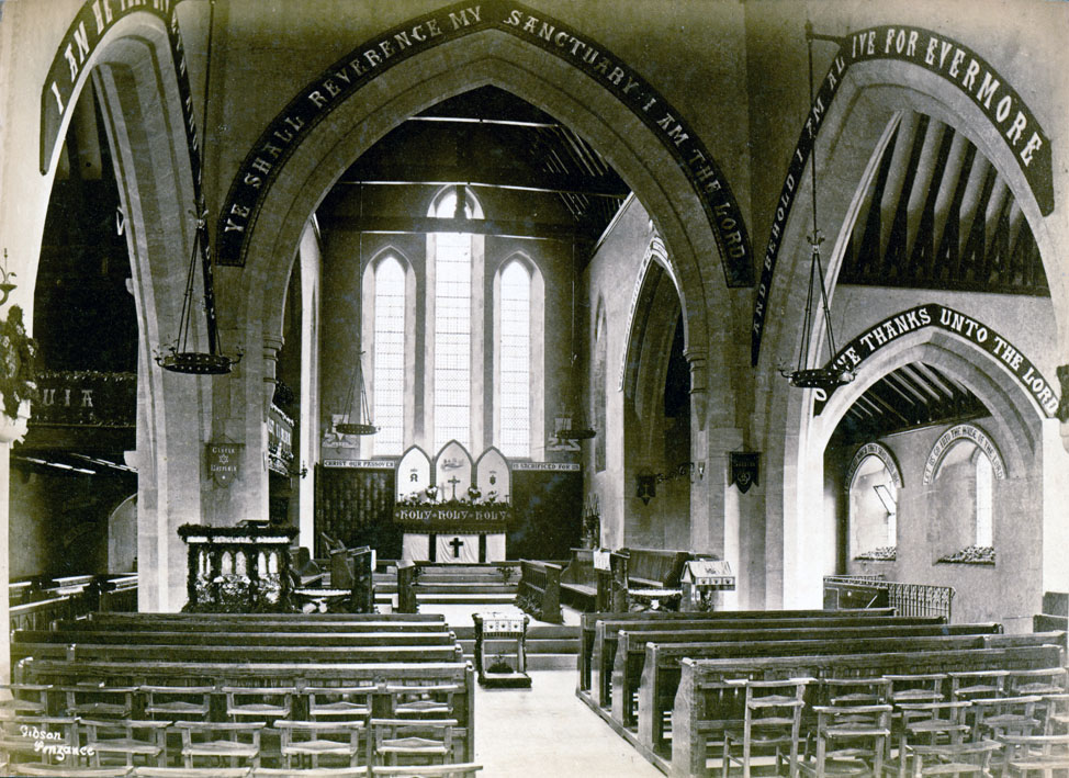 Description: A photograph of the inside of St John's Church looking towards the altar through the central arch, with ''Ye Shall Reverence My Sanctuary: I Am The Lord" engraved over the top of the arch. Designed by Piers St Aubyn FRIBA, St John's Church was built to accommodate the spiritual needs of the inhabitants of the newly built developments in East Penzance "The Battlefields". The Anglican parish church was dedicated to St John the Baptist. The parish was formed from St Mary's parish in 1883 to serve the east part of Penzance, while St Mary's served Penzance west. The church is sited at the top of Trewartha Terrace. It is built in the traditional style of elvan with Hemhill stone dressing. The foundation stone was laid on St John's Eve 1880 and was consecrated on 4 October 1881 at a cost of £7000 (over £781,000 in 2016). It was built of, and consists of, a chancel, nave of four bays, transept, aisles, east and west porches and has one bell and can hold 600 people. The register dates from 1881. Sources: Wikipedia and "The Cornwall Village" by CFWI.