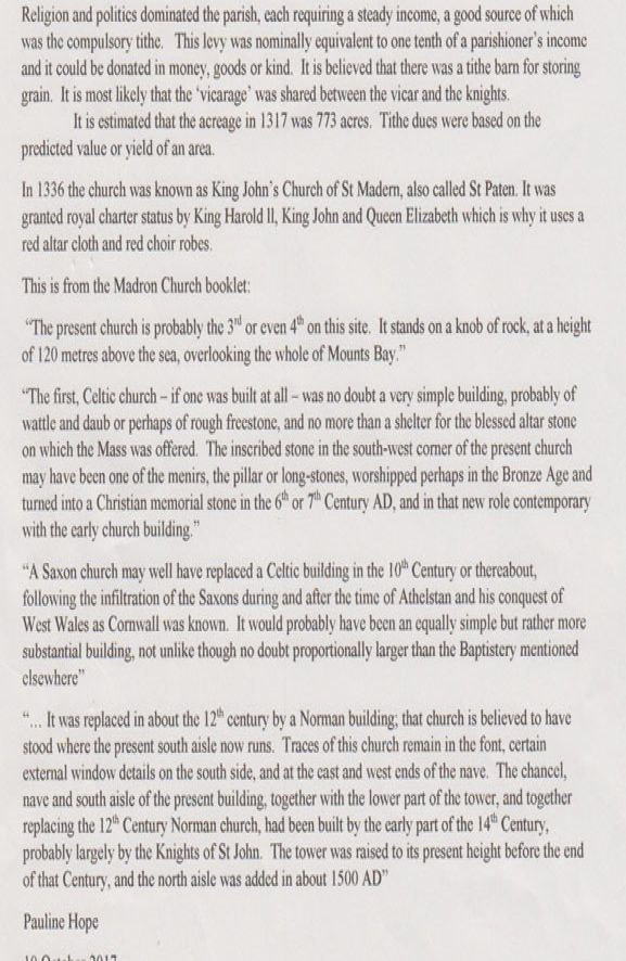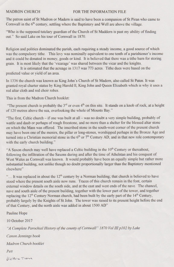 Description: A view of the interior of Madron Church from a side aisle. The patron saint of St Madron or Madern is said to have been a companion of St Piran who came to Cornwall in the 6th century, settling where the Baptistery and Well are above the village. an extract from the Madron Church booklet says that "the present church is probably the 3rd of even 4th on this site. It stands on a knob of rock, at a height of 120 metres above the sea, overlooking the whole of Mounts Bay". A further note about the history of the Church is attached.