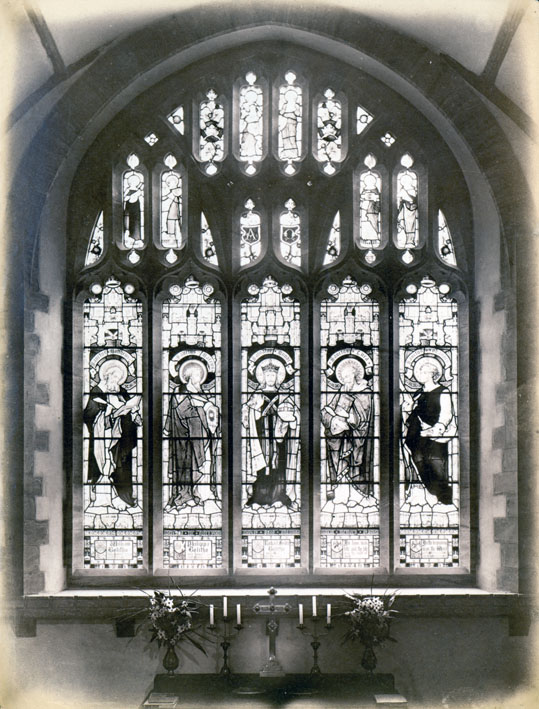 Description: The East window depicting Christ and his four disciples, Matthew, Mark, Luke and John, was the gift of Mrs R.F. Bolitho in 1895. Beneath each light are memorials for William Bolitho (1773-1856); Phillipa Bolitho (1769-1845); Richard Foster Bolitho (1799-1882); Amelia Sage Bolitho (1800-1886); William Bolitho (1830-1894). The alter table was replaced in 1932 in memory of Mr R.F. Bolitho of Ponsandane. The old alter table was used in Trythall Church until its closure in the 1980s and is now installed in the Harris Chapel in the south aisle of the Church.