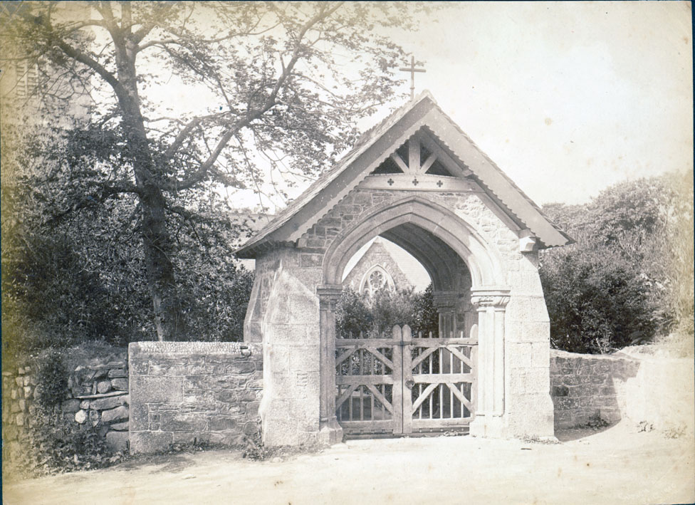 Description: A photograph of the gated entrance and archway to Gwithian Church. St Gothian's Church, Gwithian, is a Grade II listed parish church in the Church of England Diocese of Truro in Gwithian, Cornwall (Source: Wikipedia). An extract from "The Cornwall Village" by the Cornwall Federation of Women's Institutes (CFWI) reports that 'St Gothian was an Irish missionary who was martyred in the area. The first church was a tiny wooden oratory. A stone chapel was built in the 14th century but got buried in sand'.