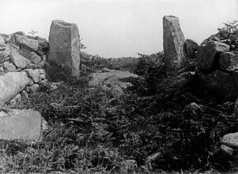 Description: A view of the ruins of Chun Castle Hill Fort, near Penzance. Constructed entirely of stone, this 3rd century BC castle translates from the Cornish 'Chy Wun' as 'House on the Hill'. 280 ft in diameter, with two concentric walls and an external ditch of rock 20ft wide, 4ft deep, 6.5ft thick and 7ft high, the inner wall was 15ft - 22ft thick tapering to a bottleneck gateway. Stone was taken from here to build Madron workhouse and Penzance streets. A well in the inner courtyard was 12 ft deep. It was re-occupied in the early AD centuries, having 15/16 stone houses built around the inner courtyards, some over the circular Iron Age huts, probably to protect the nearby local tin mines. Legend has it that the original castle was built by Jack the Tinner to store tin en route to ports at Marazion or St Ives and is on the 'Tinners Track'. Source: 'Belerion' by Craig Weatherhill 1981.