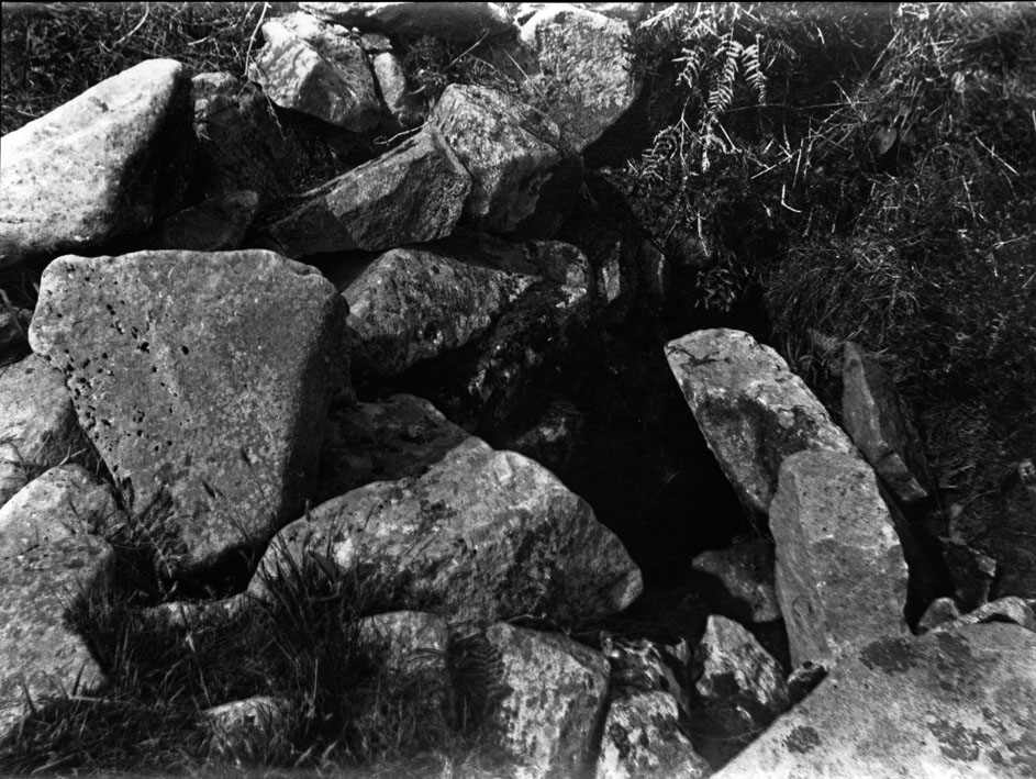Description: A view of the ruins of Chun Castle Hill Fort, near Penzance. Constructed entirely of stone, this 3rd century BC castle translates from the Cornish 'Chy Wun' as 'House on the Hill'. 280 ft in diameter, with two concentric walls and an external ditch of rock 20ft wide, 4ft deep, 6.5ft thick and 7ft high, the inner wall was 15ft - 22ft thick tapering to a bottleneck gateway. Stone was taken from here to build Madron workhouse and Penzance streets. A well in the inner courtyard was 12 ft deep. It was re-occupied in the early AD centuries, having 15/16 stone houses built around the inner courtyards, some over the circular Iron Age huts, probably to protect the nearby local tin mines. Legend has it that the original castle was built by Jack the Tinner to store tin en route to ports at Marazion or St Ives and is on the 'Tinners Track'. Source: 'Belerion' by Craig Weatherhill 1981.