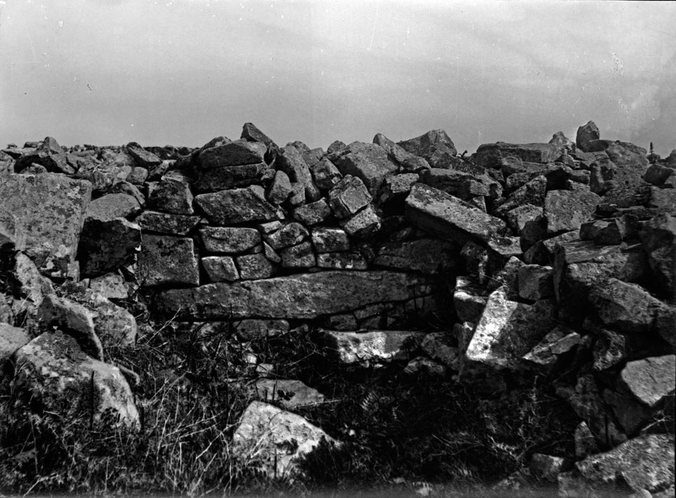 Description: A view of the ruins of Chun Castle Hill Fort, near Penzance. Constructed entirely of stone, this 3rd century BC castle translates from the Cornish 'Chy Wun' as 'House on the Hill'. 280 ft in diameter, with two concentric walls and an external ditch of rock 20ft wide, 4ft deep, 6.5ft thick and 7ft high, the inner wall was 15ft - 22ft thick tapering to a bottleneck gateway. Stone was taken from here to build Madron workhouse and Penzance streets. A well in the inner courtyard was 12 ft deep. It was re-occupied in the early AD centuries, having 15/16 stone houses built around the inner courtyards, some over the circular Iron Age huts, probably to protect the nearby local tin mines. Legend has it that the original castle was built by Jack the Tinner to store tin en route to ports at Marazion or St Ives and is on the 'Tinners Track'. Source: 'Belerion' by Craig Weatherhill 1981.