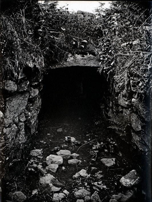 Description: The entrance to Chapel Euny subterranean passage and room, Sancreed, also known as Carn Euny (Fougou) and the Giant's Well. An extract from 'Journey Into The Stones' by Ian Cooke (1987): "In the 1950s the government took over the site. Research suggested that the site had been occupied for 700 years from 500BC. The fougou, an underground passageway, is part of a site consisting of stone and wooden housing, free standing partly below and partly above ground level. Recesses in the fougou could be blocked off by stone slabs. Carbon dating of charcoal found it to have been in use 300BC to 250BC and probably abandoned peacefully in the Middle Ages". Surrounding fields were used for growing barley and rye. Fougous existed only in Britain, West of the River Fal.