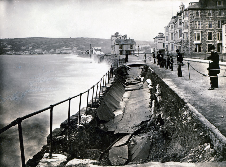 Description: A view of the storm damage on Penzance Promenade looking towards the Queens Hotel and public baths. The area has been cordoned off and unidentified people look over at the damage.