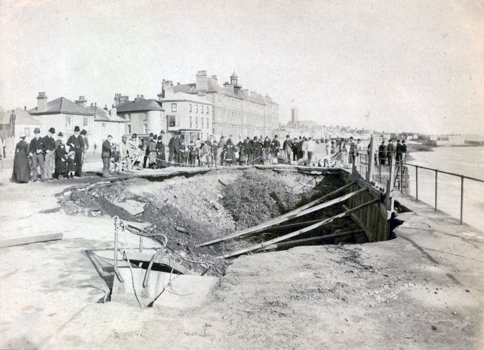 Description: A photograph of the Penzance Promenade looking towards the Queens Hotel, with the large hole created by the recent storm in the foreground. Under the Borough Surveyor, Mr H. Small, the gap had been filled with sandbags, clay, stone and rubble, but gales and a high sea on 21 February 1895, shook the ground and took 20ft of the wall and railings into the sea followed by several hundreds of tons of soil, leaving a 60ft by 40ft hole.