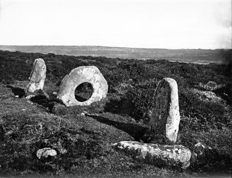 Description: 'Men an Tol' translates to Stone of the Hole. This Bronze Age Stone stands on the moors between Ding Dong and Busollow (near Newbridge). Some two centuries ago the longstones were moved to be in alignment with the 'Men and Tol' possibly an early way of telling the time of day, with the sun shining through. Local people believed that it would cure rickets if they passed their children through the hole nine time. Other Historians believed that it had fertility rites when young girls were passed through it.