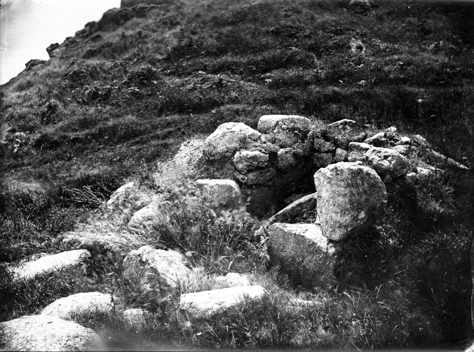 Description: A photograph of the stones capping what was once St Levan's well. According to Ancient and Holy Wells of Cornwall by M. & L Quiller-Couch: "On elevated rocks on Porthchapel Point, this is the spot chosen by St Levan for the chapel/hermitage on the edge of the cliff joined to well by steps which have (since) disappeared". It is about 3ft square. St Levan was said to have survived on one fish daily plus water from this well.