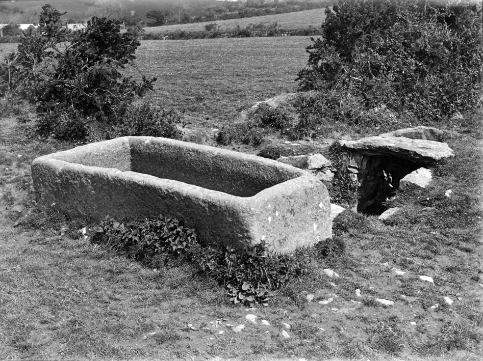Description: A photograph of what appears to be an open stone coffin and the entrance to an underground passage or cavern. The stone coffin was moved into the side garden of Treneere Manor House many years ago. The site is now owned by the Penwith and Truro College. See also 2016.60.1627