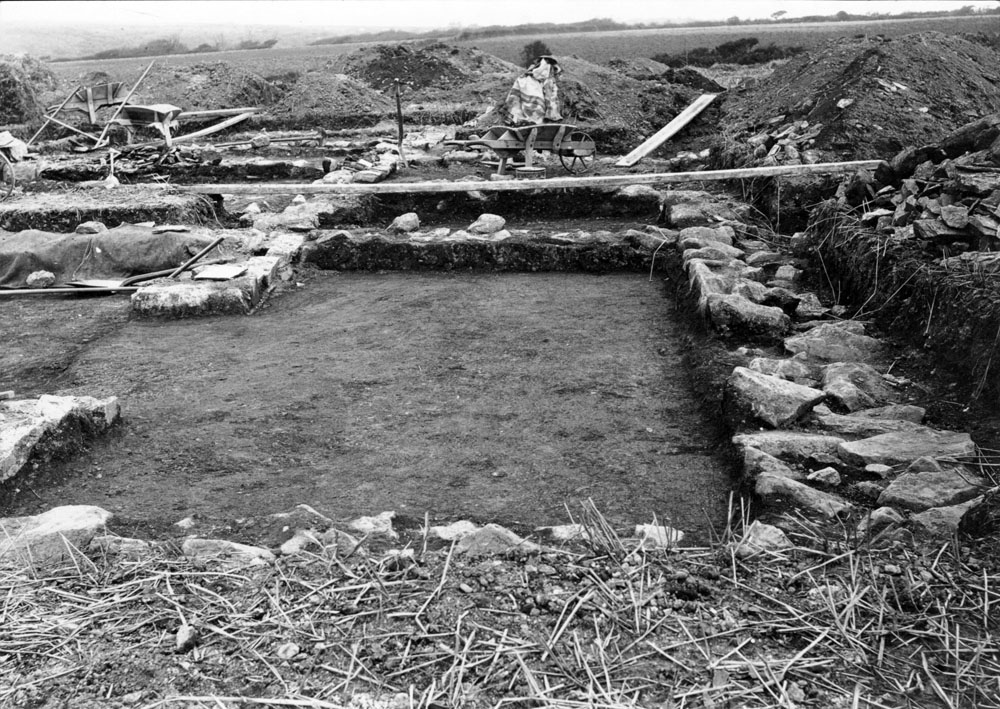 Description: Roman villa near Camborne. These photographs were taken by Herbert Gibson in 1931 and are part of a series 2016.50.952 to 2016.50.953. The farmer who owned the land, Mr Benjamin Mitchell, had earlier that year found some tesserae while ploughing and made enquiries. These soon led to the British Museum confirming that the tiles were "almost certainly Roman". A decision was taken to excavate the site, funds were raised and after harvest that year the archaeologists moved in. They worked from 8 September to 3 October 1931. The was then opened to the public for one week before it was again covered in soil to protect it from weather damage. Some denarii coins found help to date the supposed abandonment of the villa to about AD 230-240. Thus a suggested date of 2nd or 3rd century is given for its origins. This photograph shows another view of the room in image 2016.50.955 with the opus signinum floor and part of the second phase of development. (Reference especially B.H.St J O'Neil: The Roman Villa at Magor Farm).