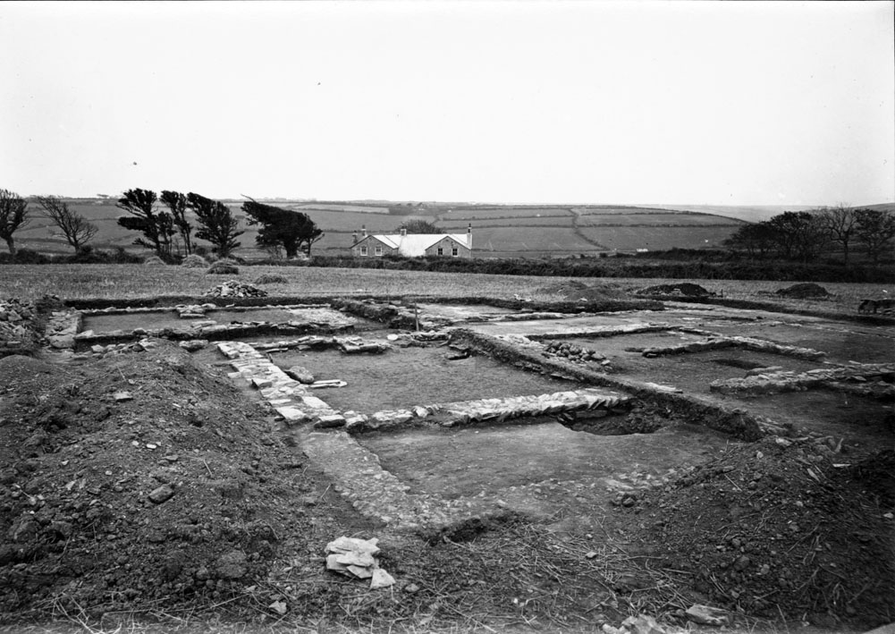 Description: Roman villa near Camborne. These photographs were taken by Herbert Gibson in 1931 and are part of a series 2016.50.952 to 2016.50.976. The farmer who owned the land, Mr Benjamin Mitchell, had earlier that year found some tesserae while ploughing and made enquiries. These soon led to the British Museum confirming that the tiles were "almost certainly Roman". A decision was taken to excavate the site, funds were raised and after harvest that year the archaeologists moved in. They worked from 8 September to 3 October 1931. The was then opened to the public for one week before it was again covered in soil to protect it from weather damage. Some denarii coins found help to date the supposed abandonment of the villa to about AD 230-240. Thus a suggested date of 2nd or 3rd century is given for its origins. This photograph shows a general view of the layout of the site. In the centre of the picture is the largest room, the one that contains the wall recess where the denarii were found. The nearer rooms are the ones believed to be part of the second stage of the building. (Reference especially B.H.St J O'Neil: The Roman Villa at Magor Farm).