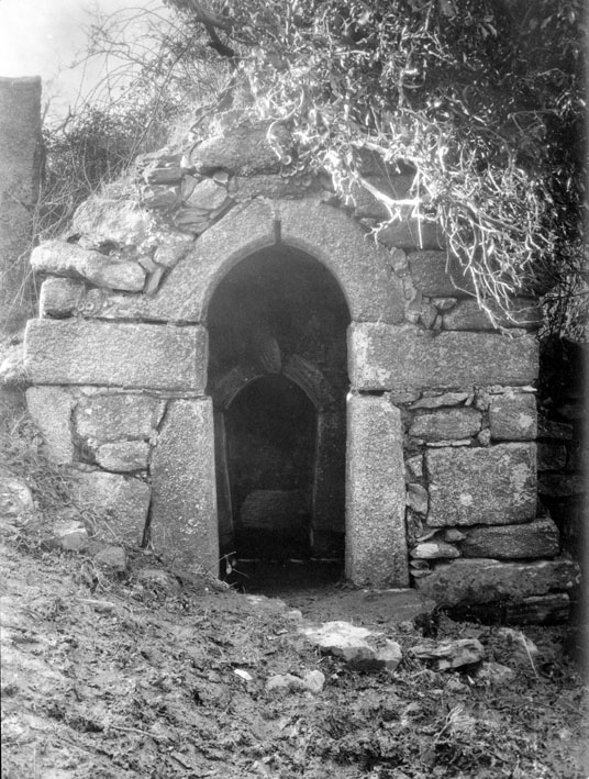 Description: Trelill medieval holy well stands in the corner of a field to the SE of Trelill farm at grid ref: SW6788 2847. Quiller-Couch in his book entitled 'Ancient and Holy Wells of Cornwall' (1894) refers to the well as Helstone Holy Well: ..."a very beautiful and fair-sized building of large granite blocks, with a pointed roof, the interior of which is arched on either side, the actual top being composed of two large granite slabs. A rounded arch, five feet seven inches high, and three feet two inches wide, forms the entrance, and on either side of the interior is a rude granite slab, forming a seat. At the back of the interior is another and smaller arch, this forms a recess of thirty inches overarching the actual well, the water or which is deep and clear; the larger building being dry and paved with stone". In Helstone, its fame seems to be almost entirely forgotten; but one woman, on being questioned, remembered visiting the spot in her girlhood for the purpose of dropping a pin accompanied by a wish into its magic waters; she also spoke of a tradition which explained that many years ago, Wendron Church was being built upon the spot but for some reason, unknown to present day, there were strong objections to this locality, and crows came by night and removed every stone, with the exception of the porch, which remaining portion now forms the covering of the well.