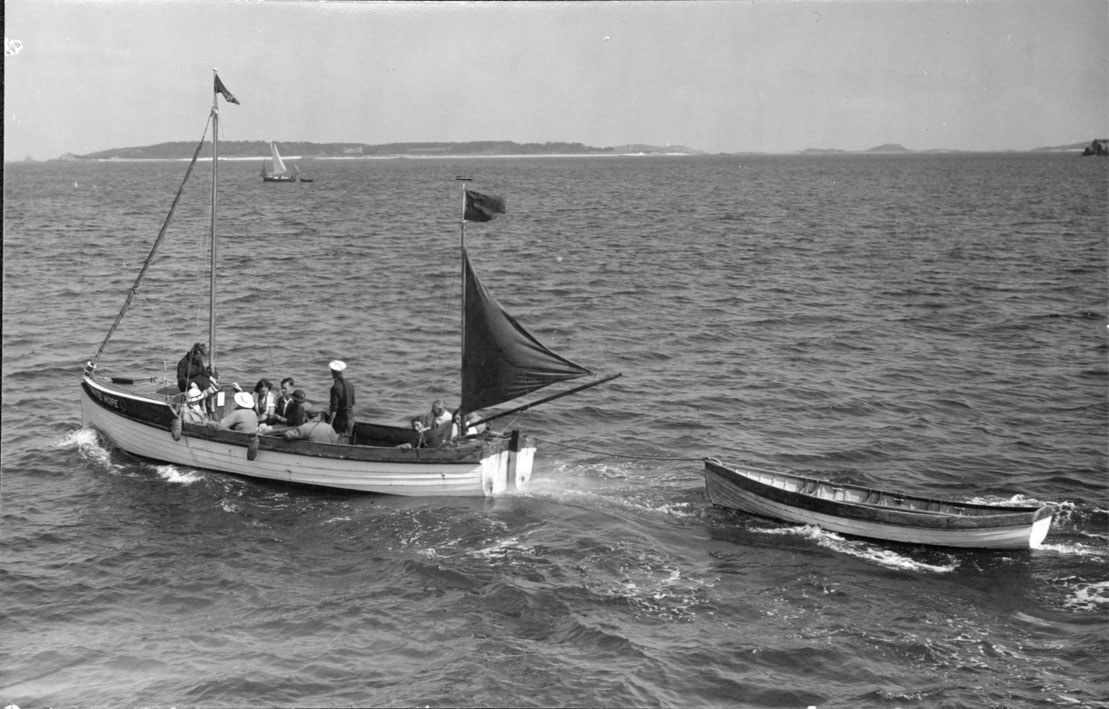 Description: In the early 1920s, a long stay visitor to the Atlantic Hotel was unable to pay his bill. Mr Poynter, the owner of the Hotel, accepted the visitor's boat in settlement of his account. This boat named 'White Hope' was the first motor tripper boat on the Isles of Scilly. Mr Poynter was encouraged by Captain Stephen Jenkins to use the boat as a business which he did. The cost of a trip to the other islands was 1shilling each. She carried 12 passengers and was a great success, soon followed by the 'Bonnie Jean' and other boats. In this image, the 'White Hope' is towing a skiff for landing her passengers on the off-islands.
