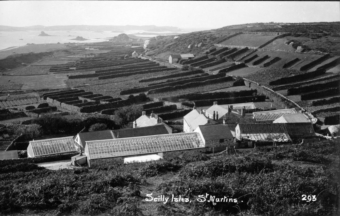 Description: A postcard of Middletown Down towards Lowertown. Only the longest of the four green houses shown still stand, although about a third of it has been roofed over. The house at the front right was knocked down and rebuilt in 2000. The fields in the background were cultivated for flower farming and the larger fields for livestock at the time of the picture. Some of the smaller fields are now used for holiday chalets.
