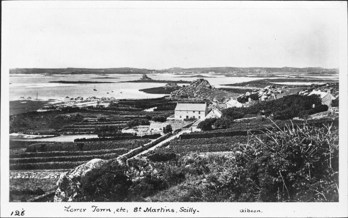 Description: A view of Lower Town, St Martins, Isles of Scilly looking towards Tresco. From left to right: Tresco; Hedge Rock; Ashvale Farm; Hilldrop Cottage; Appletree; and the Elms to the far right (which become the Sevenstones Inn in the 1970s). A track which becomes a road in the 1950s runs up the centre and there are small fishing boats in the entrance to Tean Sound.