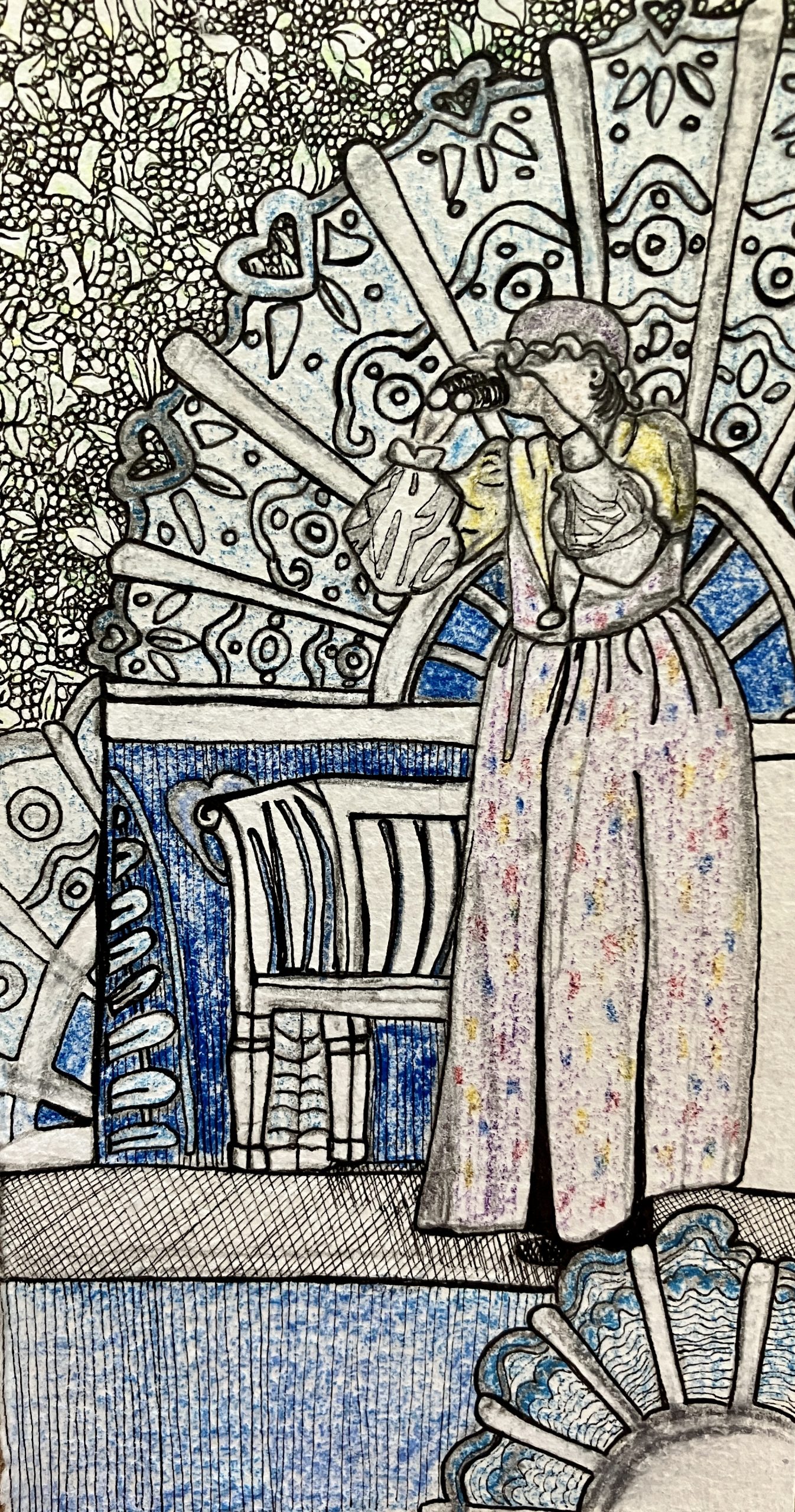 Isadora Malik’s artworks might have fallen out of the pages of a story book, with strong themes of narrative and identity, they have a bold dreamlike quality. Born in Southeast London, she was educated at UAL Camberwell and UCA Canterbury. Malik moved to Cornwall in 2021 and now lives and works in Penzance.